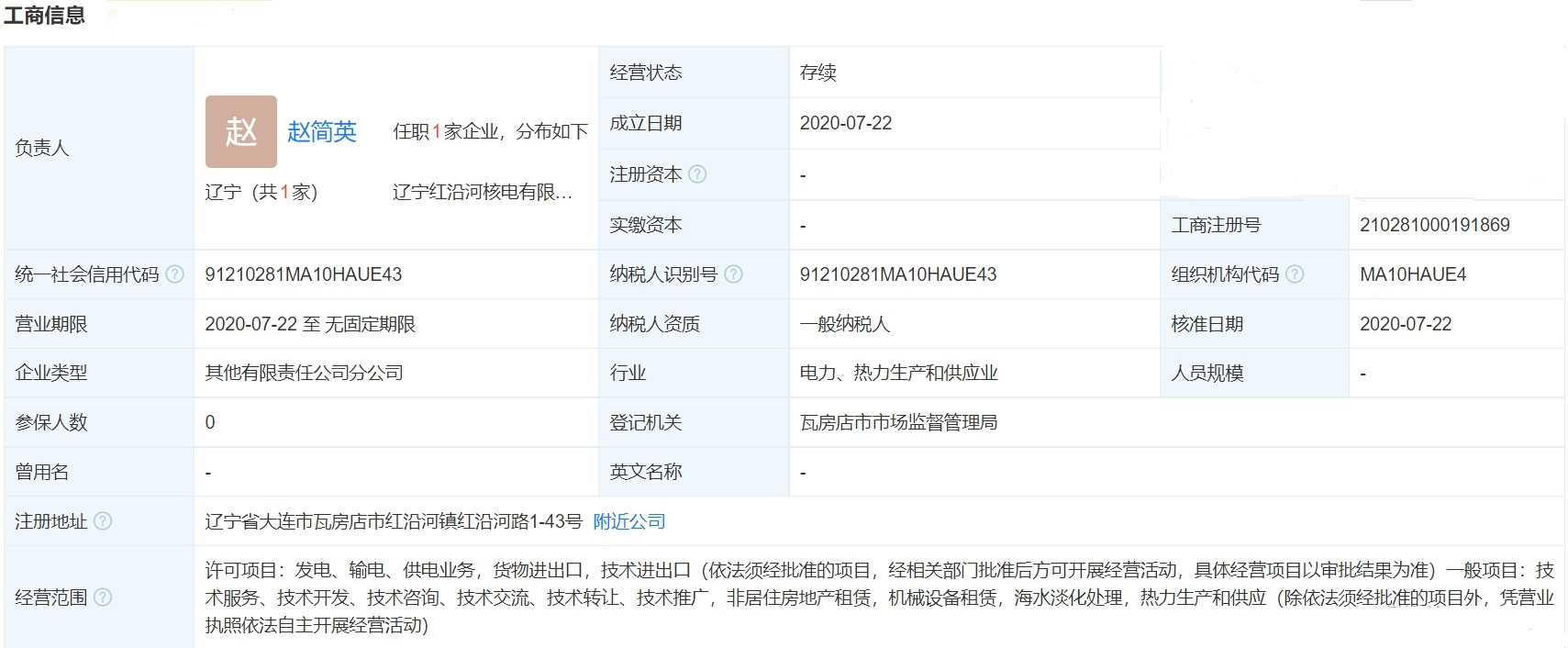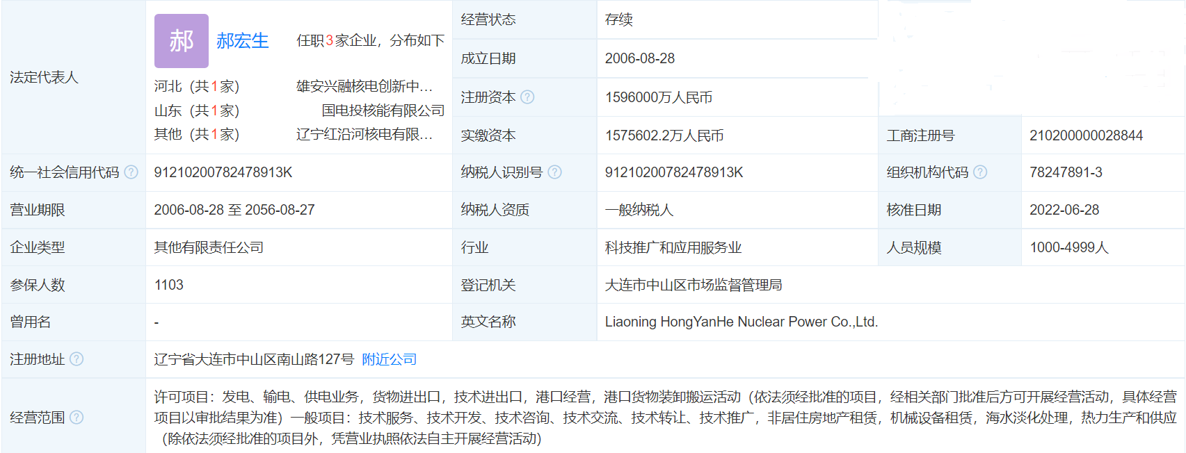 遼寧紅沿河核電有限公司工商注冊登記信息